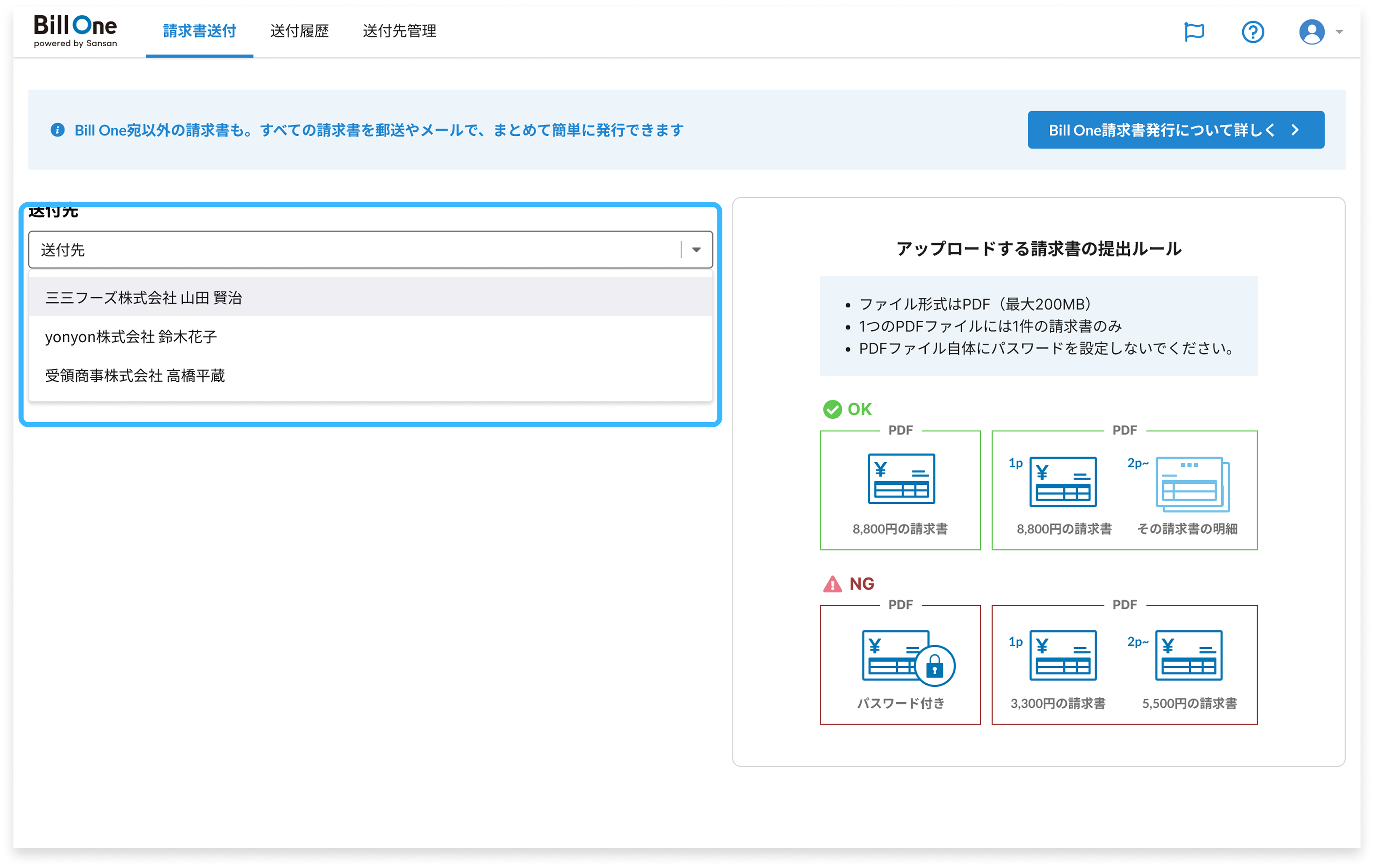 請求書発行システム側の画面での送付先情報を登録する際の注意