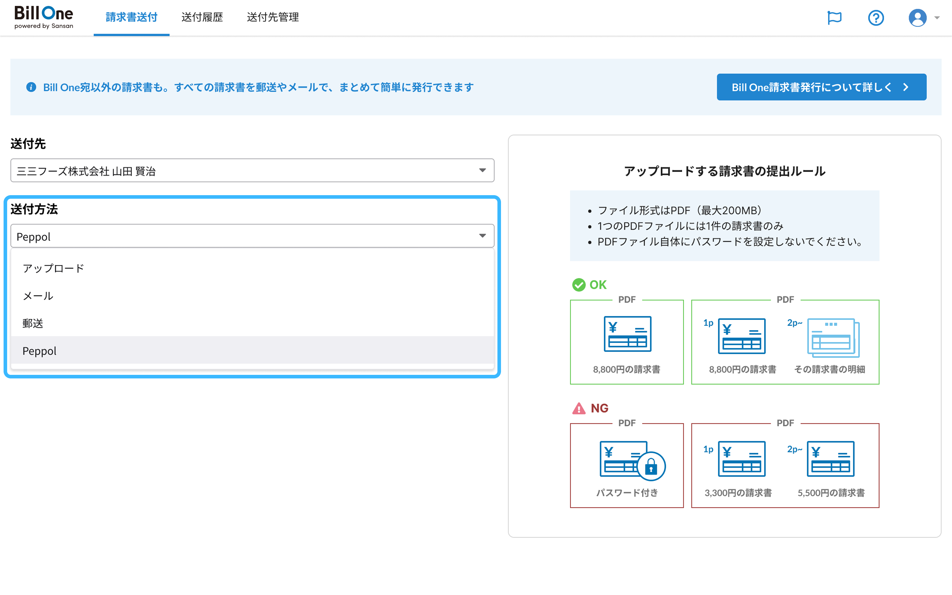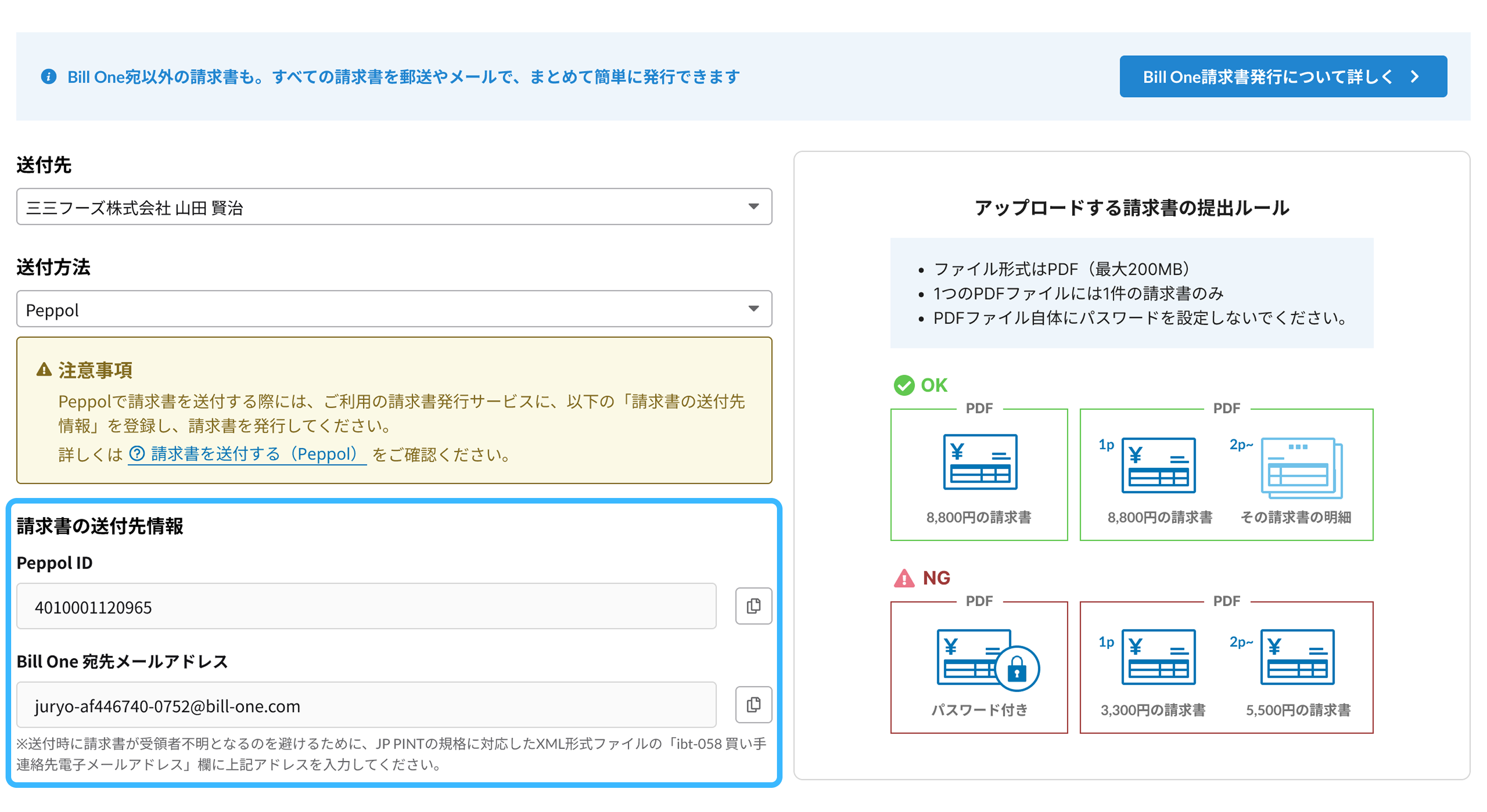 [Peppol ID]だけでなく[Bill One 宛先メールアドレス]も忘れずにご利用の請求書発行システムに登録してください。[Bill One 宛先メールアドレス]の登録がない場合、受領企業側で請求書を受け取った際に、受領者不明として処理されます。