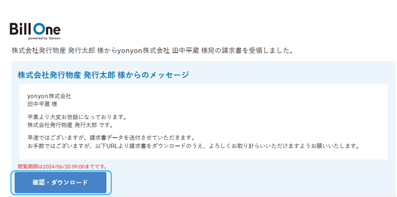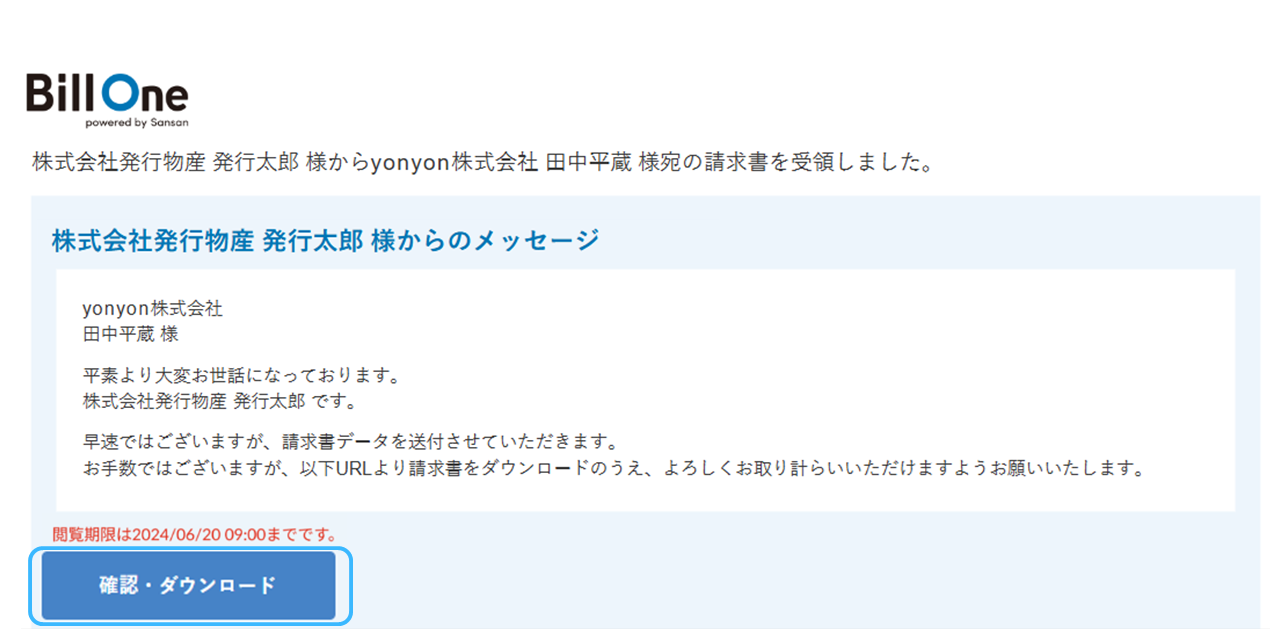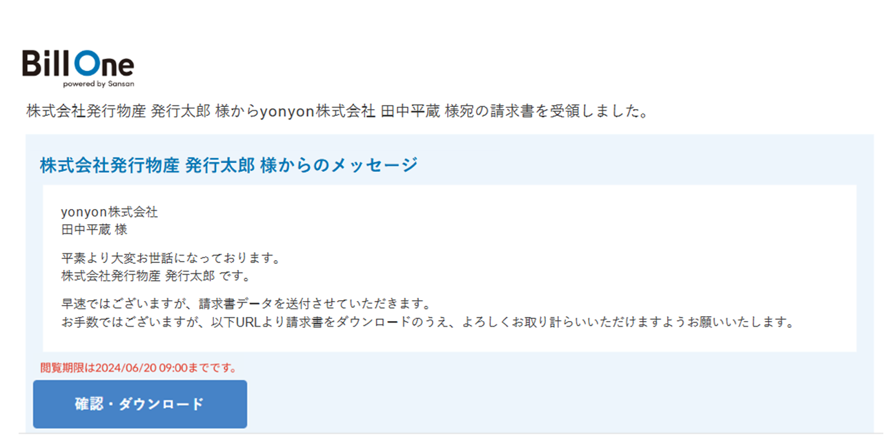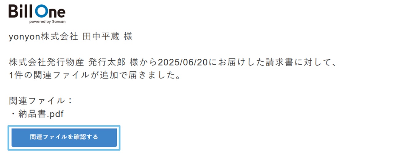 お取引先様からBill Oneを利用して請求書を発行すると、以下のようなメールが届きます。