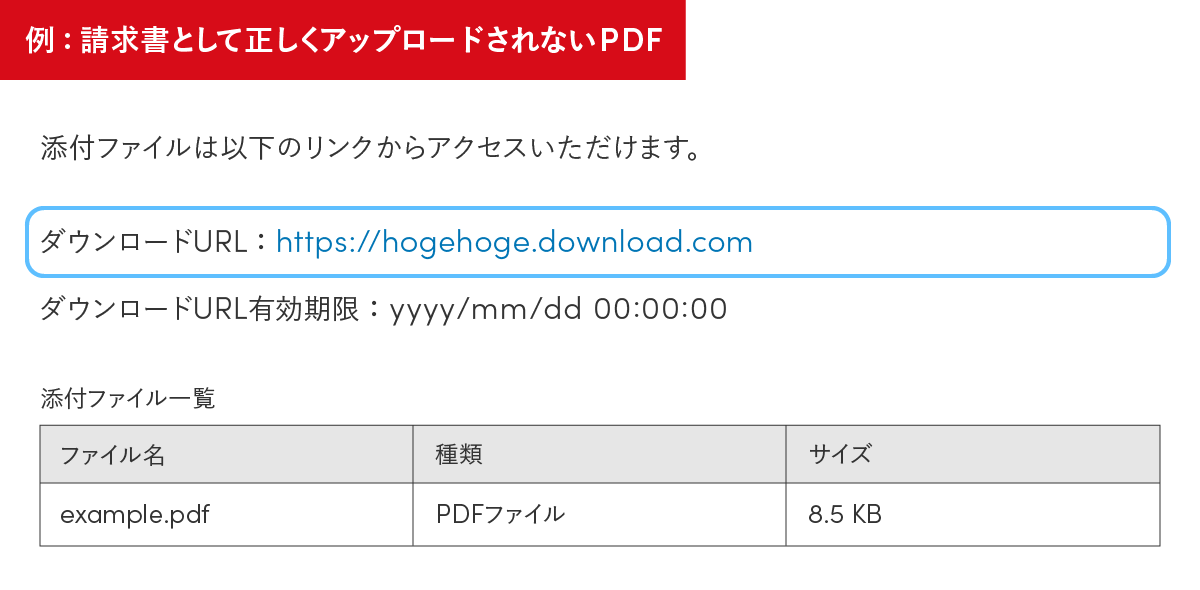 - 請求書発行システムによっては、メールに添付されたPDFファイル内に請求書のダウンロードURLが記載される形式があります。Bill Oneでは、受領したPDFをそのまま請求書として処理するため、以下の例のようにPDF内にダウンロードURLが記載されている場合、PDF内のURLにはアクセスせず、そのままアップロードします。そのため、請求書をダウンロードするURLは、必ずメール本文内に直接記載してください。